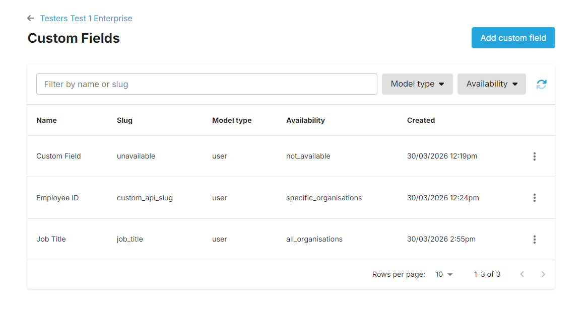Note: Enterprises may configure up to 3 Custom Fields. When a field is added, it applies to all users within the specified organisation; you cannot restrict these fields to specific groups or sub-teams at this time.