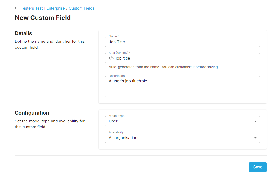 Important: Once created, these fields will immediately become available in the profile settings of every user within the specified organisations. While a Custom Field’s details and availability may be edited after its creation, the Slug (API Key) and the Model Type cannot be changed.