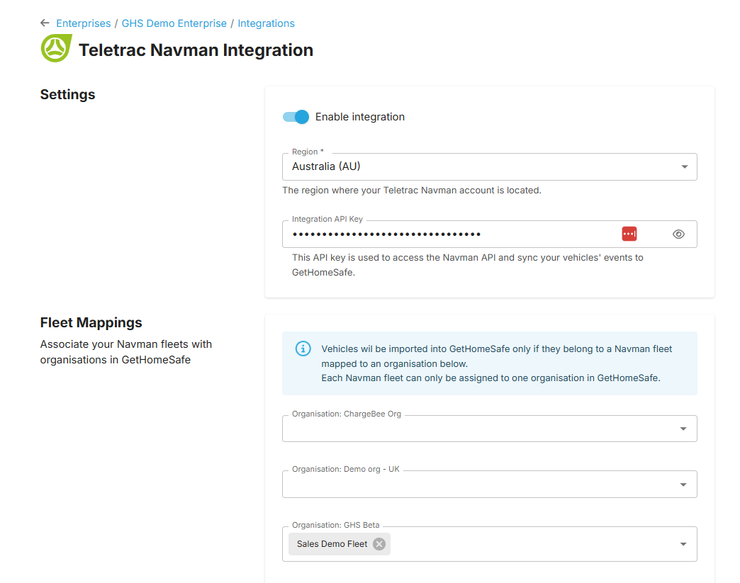 Enabling this integration allows you to import your Teletrac Navman vehicles, it syncs their locations and events, and associates your vehicle fleets with organisations within GetHomeSafe.