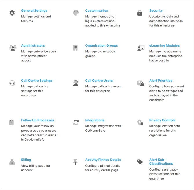 Note: For account name changes, enabling call centre and GPS devices for your account contact support@gethomesafe.com. Some feature enablement will be unavailable to edit, if you need to upgrade your plan this can be done via the billing menu.