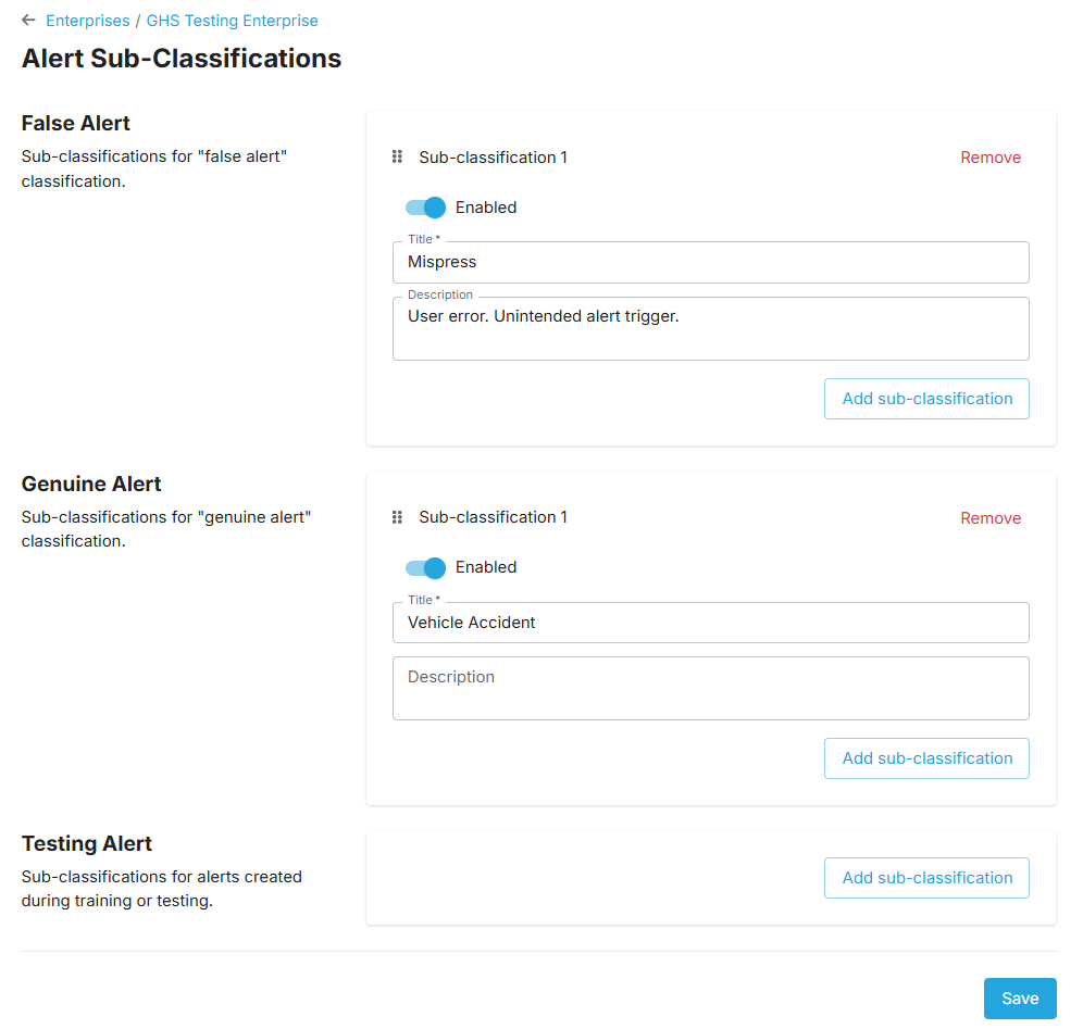 Sub-classifications are an optional label that may be attached to an alert classification to provide additional context to resolved alerts. When configured, they will be available for selection during alert classification when their primary alert classification (Genuine, False, Testing) is selected.