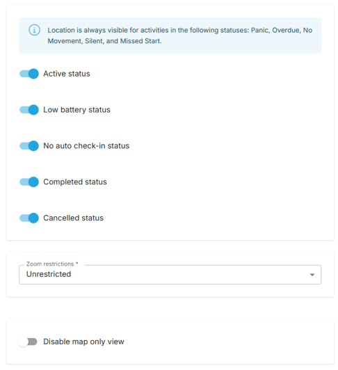 Privacy controls can be customised to apply only to specific activity statuses, including Active, Low Battery, No Auto Check-In, Completed, and Cancelled. For alert statuses such as Panic, Overdue, No Movement, Silent, and Missed Start, location data will always be visible and cannot be restricted through settings. Users will always have access to their own activity’s location data regardless of which statuses are enabled.