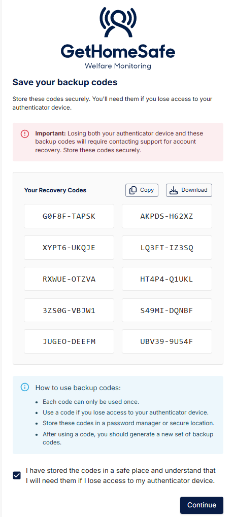 During a user’s initial 2FA setup or reset, the system will generate 10 unique 10-digit, one-time use codes linked to the user's account. These codes must be stored securely and can be used to bypass the standard authenticator requirement. The user is advised to generate a new batch of codes after account recovery to ensure this recovery option remains available.